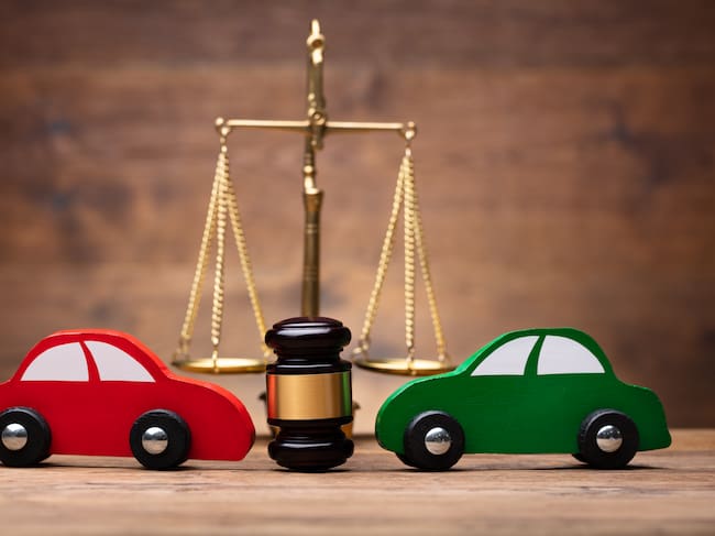 Carros simulando un accidente de tránsito con un mazo de juez (Getty Images) / AndreyPopov