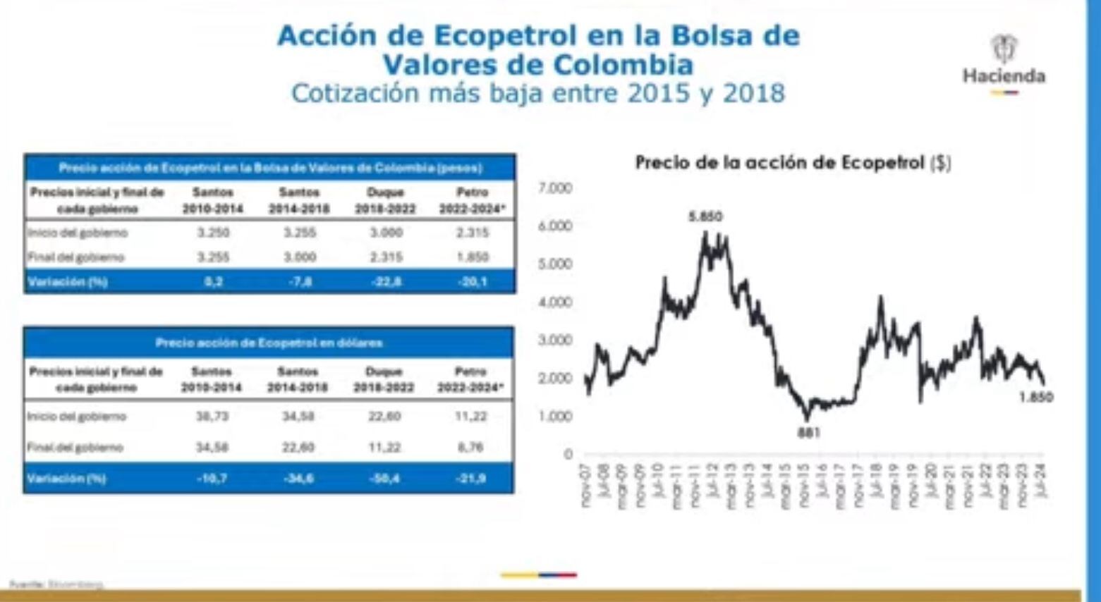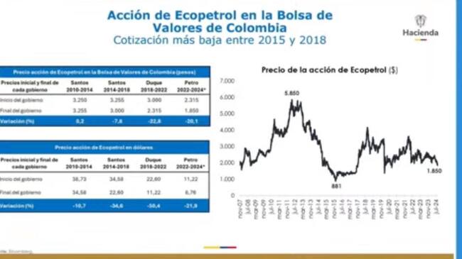 Así las cosas, con un gráfico, el ministro explicó que al inicio de este Gobierno del presidente Gustavo Petro la acción de la petrolera estaba en un precio de $ 2.315 y hoy en día está en un precio de $1.850, es decir, una reducción del 20%.