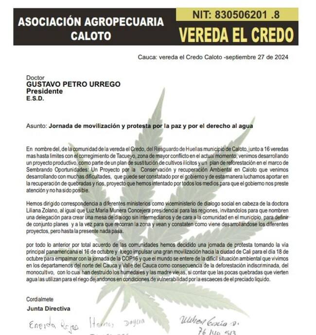 La Asociación Agropecuaria de Cultivadores del municipio de Caloto informó que se trata de población de 16 veredas, incluida la de El Credo, afiliadas, que en una comunicación dirigida al presidente Gustavo Petro, exigen al Gobierno nacional entablar una mesa de diálogo sin intermediarios para atender las problemáticas, “de lo contrario, el 16 de octubre saldrán a la vía Panamericana y dos días después llegarán a Cali en el marco de la COP 16″, advirtieron.