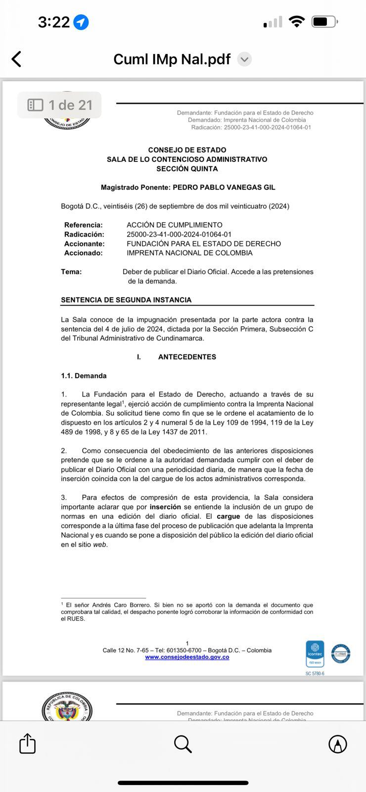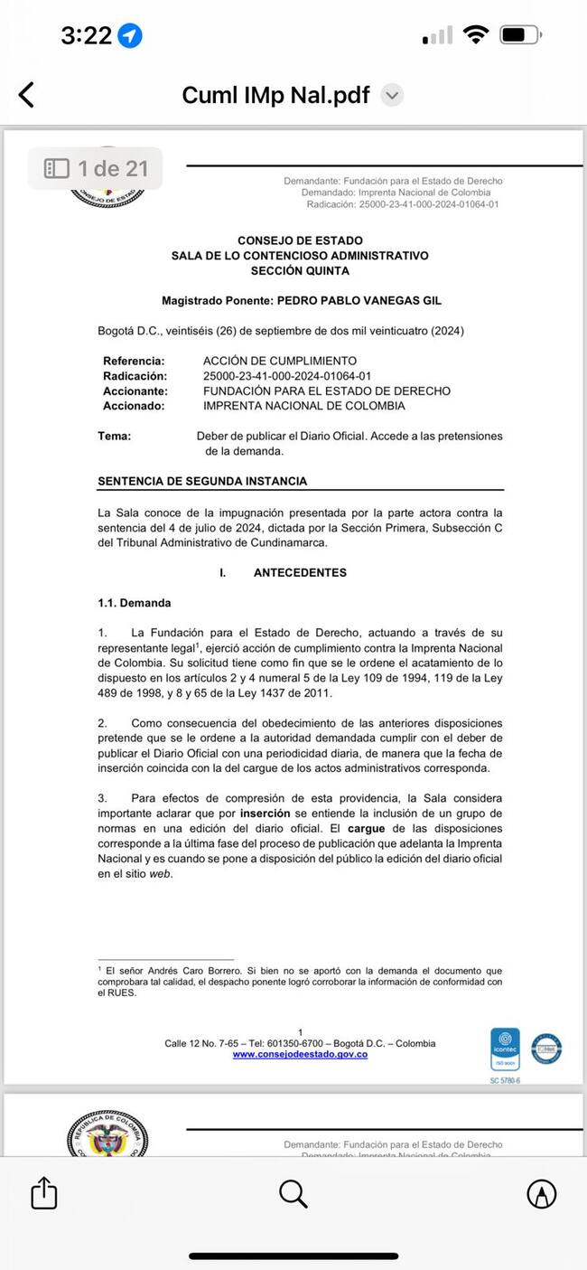 La acción constitucional fue interpuesta tras evidenciar que la Imprenta Nacional no publica de manera oportuna en la página web oficial las leyes y actos administrativos expedidos por las autoridades. Aunque el Diario Oficial asigna una fecha para cada publicación, la efectiva difusión en línea ocurre después, afectando el conocimiento público de las normas.