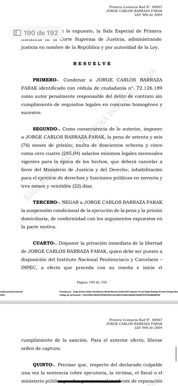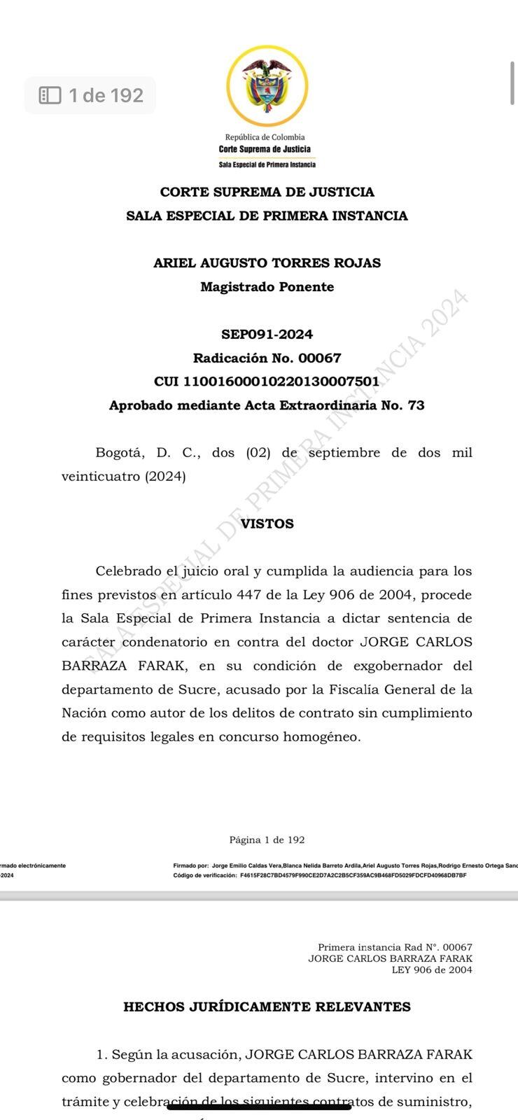 La Sala Especial de Primera Instancia de la Corte Suprema de Justicia condenó a Jorge Carlos Barraza Farak, exgobernador de Sucre, a seis años y medio de prisión por el delito de contrato sin cumplimiento de requisitos legales en concurso homogéneo y sucesivo. El fallo también impuso una multa equivalente a 285.04 salarios mínimos legales mensuales y una inhabilidad para ejercer funciones públicas por 93 meses y 22 días.