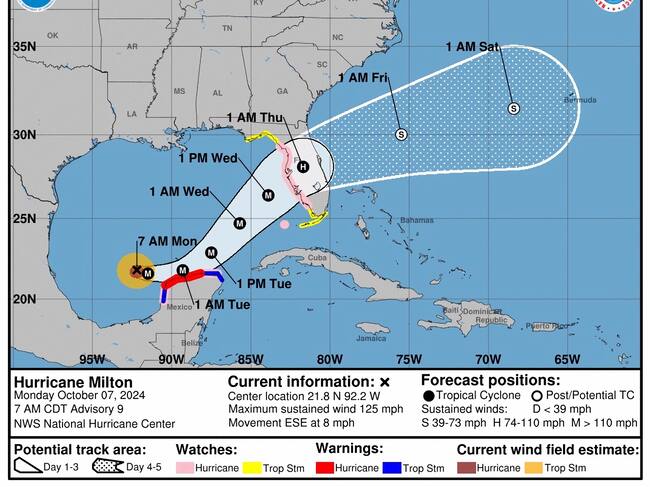 De acuerdo con el Centro Nacional de Huracanes (NHC, en inglés) de EE.UU., Milton perdió un poco de intensidad y en la tarde de hoy presentaba vientos máximos sostenidos de 215 kilómetros por hora, no obstante ha crecido de tamaño y sus vientos con fuerza de tormenta tropical se extienden hasta unos 400 kilómetros desde su centro.