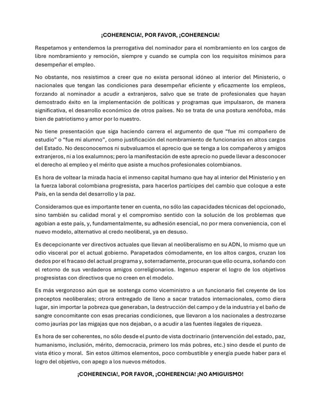 Finalmente, la misiva señala que “es hora de voltear la mirada hacia el inmenso capital humano que hay al interior del Ministerio y en la fuerza laboral colombiana progresista, para hacerlos partícipes del cambio que coloque a este País, en la senda del desarrollo y la Paz”.