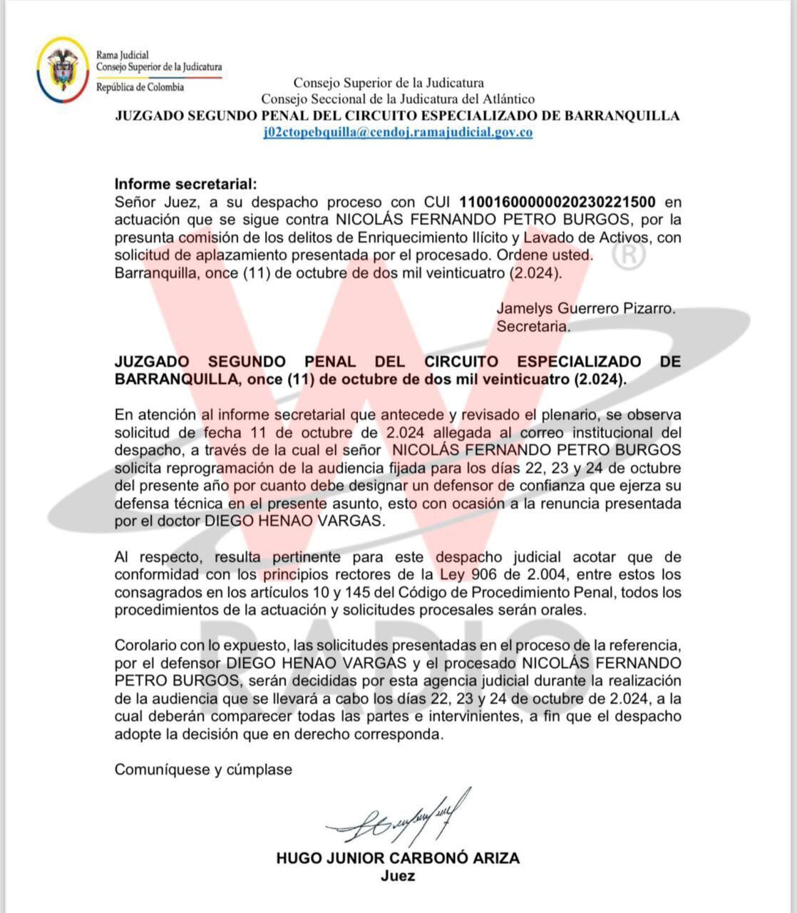 “Corolario con lo expuesto, las solicitudes presentadas en el proceso de la referencia, por el defensor Diego Henao Vargas y el procesado Nicolás Fernando, de la audiencia que se llevará a cabo los días 22, 23 y 24 de octubre de 2024, a la cual deberán comparecer todas las partes e intervinientes, a fin de que el despacho adopte la decisión que en derecho corresponda”, dice el documento conocido por W Radio y firmado por el juez Hugo Junior Carbonó.