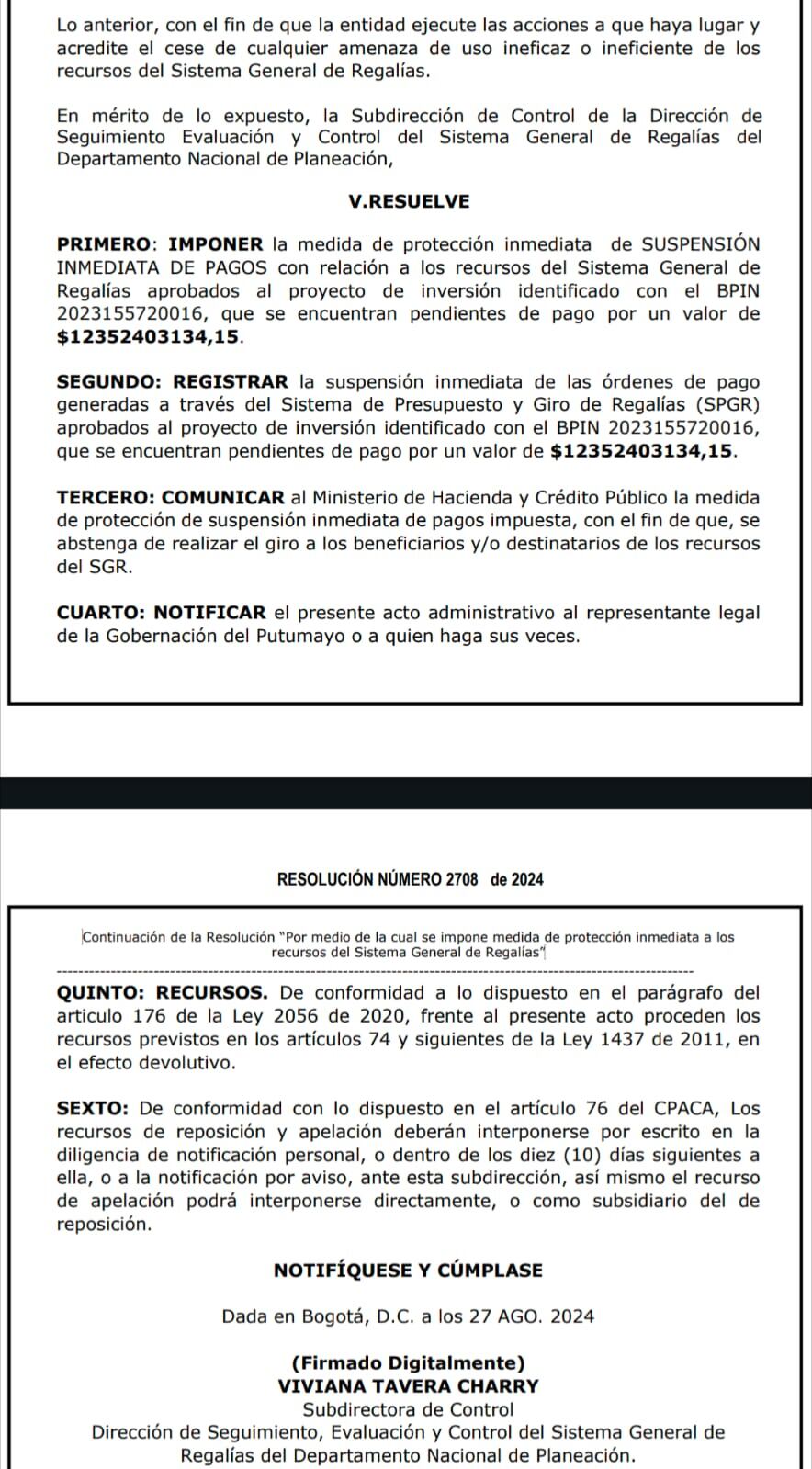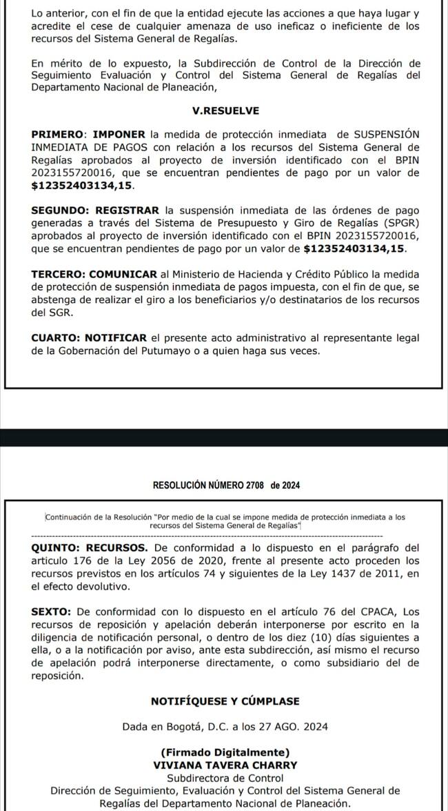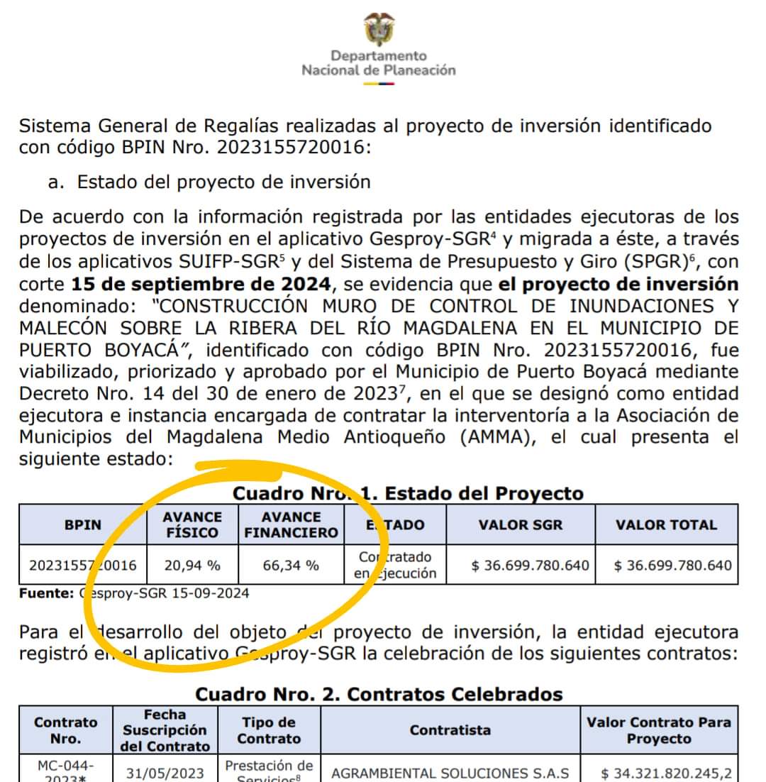 La resolución 2708 de 2024 del DNP formaliza la suspensión inmediata de pagos y remite el caso a la Fiscalía General de la Nación, la Procuraduría y la Contraloría, esta última, ya está investigando las posibles irregularidades. El proyecto del Malecón, que tenía un presupuesto total de 36.000 millones de pesos, ha quedado en el limbo, generando preocupación en la comunidad de Puerto Boyacá.