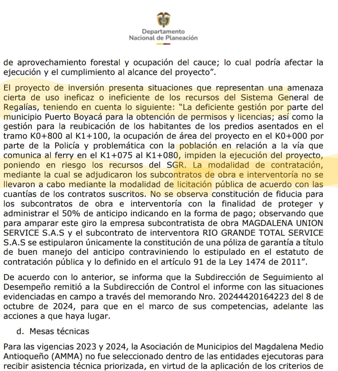 Informe entregado por el Departamento Nacional de Planeación acerca del Malecón en Puerto Boyacá, realizado por la Asociación de Municipios del Magdalena Medio Antioqueño.