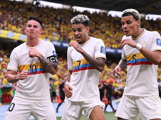 Luis Díaz celebra su gol junto a James Rodríguez (izq.) y Richard Ríos (der.). Foto: RAUL ARBOLEDA/AFP via Getty Images. / RAUL ARBOLEDA