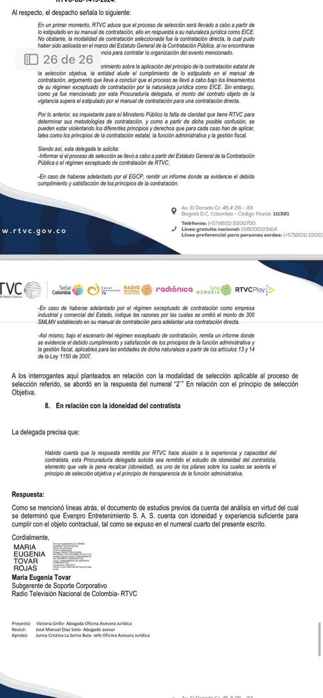 En cuanto a las inquietudes de la Procuraduría sobre la falta de pluralidad de oferentes, RTVC indicó que, aunque Evenpro fue el único proveedor, su oferta fue examinada para garantizar que cumpliera con los estándares históricos requeridos por la entidad para eventos de esta naturaleza.