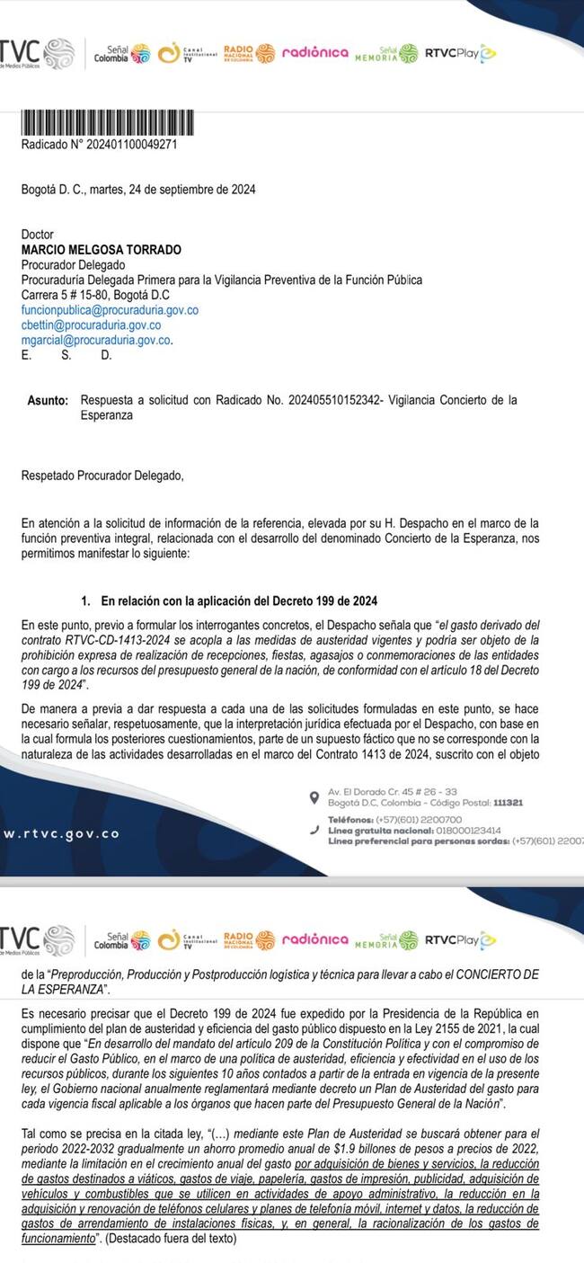 RTVC justifica ante la Procuraduría la contratación directa de 2.200 millones para el “Concierto de la Esperanza”. Según RTVC, la empresa tenía la representación exclusiva de los artistas, lo que justificó la contratación sin licitación.