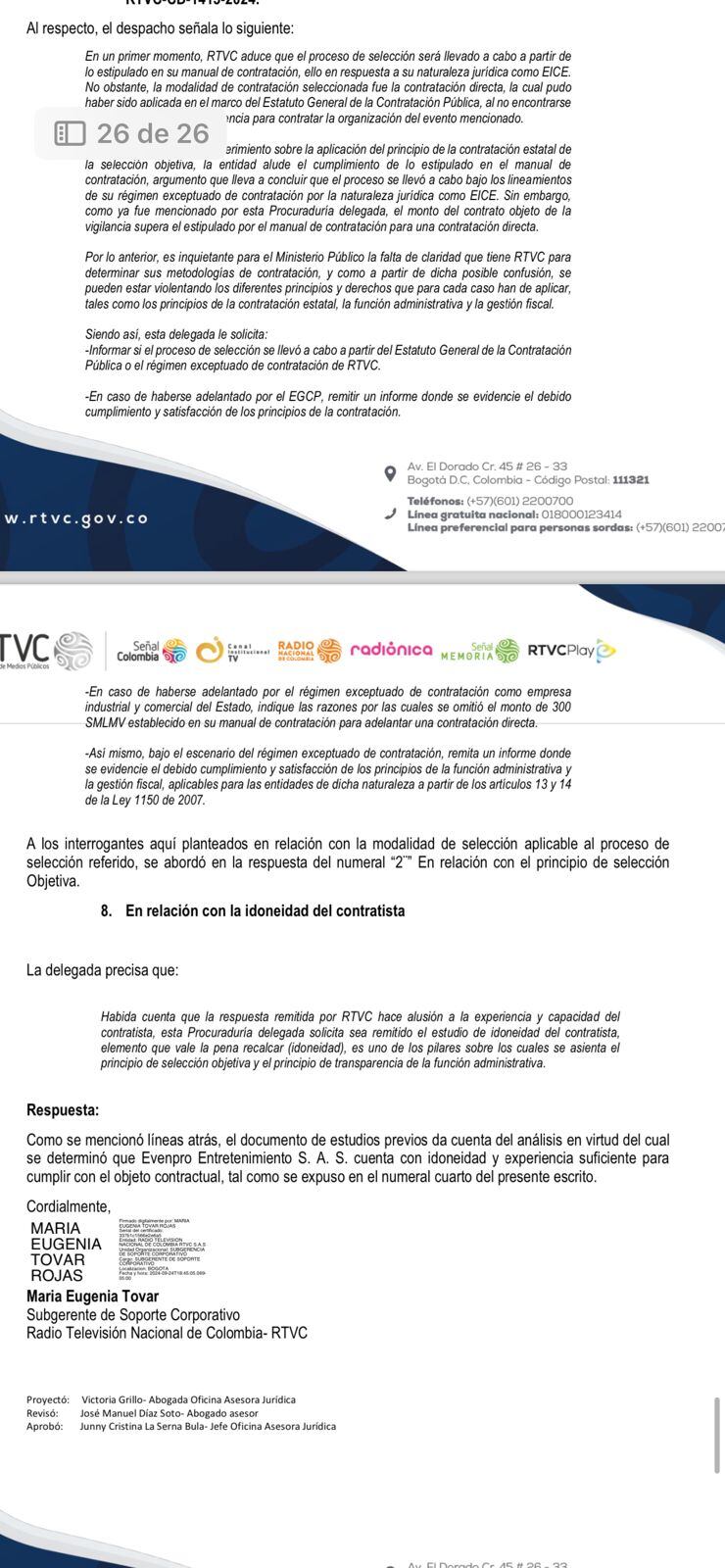 En cuanto a las inquietudes de la Procuraduría sobre la falta de pluralidad de oferentes, RTVC indicó que, aunque Evenpro fue el único proveedor, su oferta fue examinada para garantizar que cumpliera con los estándares históricos requeridos por la entidad para eventos de esta naturaleza.