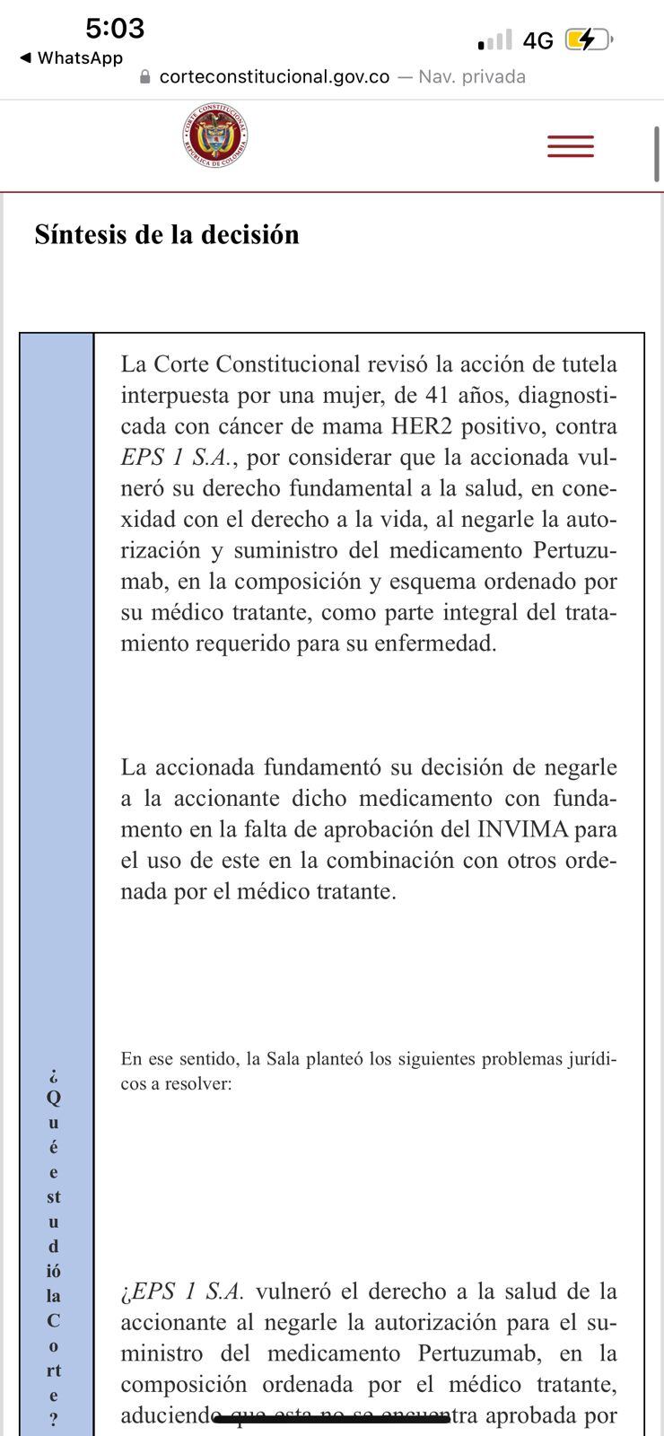 “En cuanto a la filtración de la información confidencial de la paciente a terceros no autorizados, la Sala estableció que la IPS tenía a su cargo la custodia de la historia clínica. Aunque existen protocolos para proteger los datos confidenciales de los pacientes, la Corte concluyó que el prestador es responsable por su manejo. En este caso, algunas personas adscritas a la IPS incumplieron el deber de confidencialidad al divulgar la información de Paula a la Fundación que la contactó sin su autorización”, señaló la Corte.