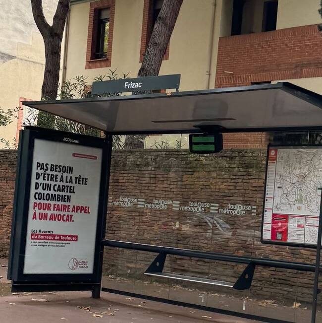 Publicidad en Toulouse que dice: “No hace falta estar al frente de un cartel colombiano para necesitar un abogado”.