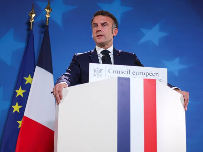Brussels (Belgium), 17/10/2024.- French President Emmanuel Macron speaks during a press conference after attending the European Council Summit in Brussels, Belgium, 17 October 2024. EU leaders are meeting in Brussels to discuss Ukraine, the Middle East, competitiveness, migration and foreign affairs. (Bélgica, Ucrania, Bruselas) EFE/EPA/CHRISTOPHER NEUNDORF / CHRISTOPHER NEUNDORF (EFE)