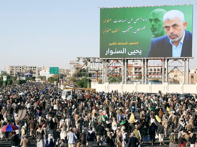 Manifestantes tras la muerte de Yahya Sinwar. FOTO: Mohammed Hamoud/Getty Images / Mohammed Hamoud