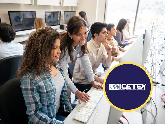 Estudiantes universitarios en clase, al lado el logo del ICETEX (GettyImages / Redes sociales)