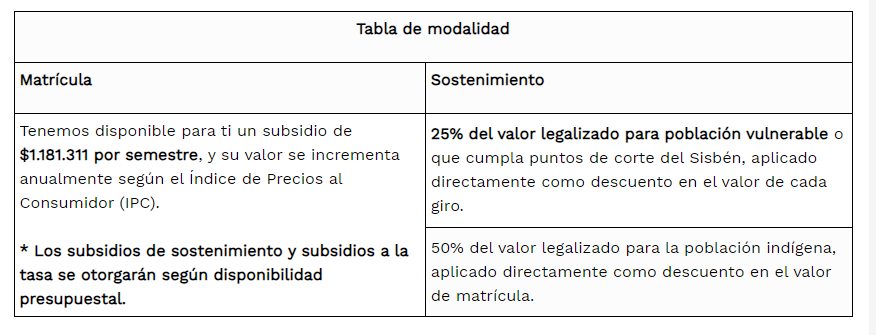- Los beneficiarios de crédito educativo que modifiquen su condición a nivel de Sisbén o población vulnerable posterior a la fecha de adjudicación del crédito educativo no tendrán derecho a este beneficio.