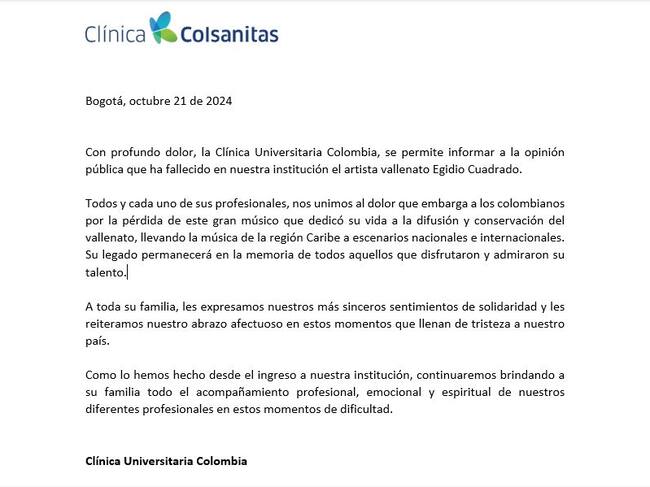 La clínica confirmó el fallecimento del artista vallenato en un comunicado expedido este lunes en el que señala que todos sus profesionales se unen “al dolor que embarga los colombianos por la pérdida de este gran músico que dedicó su vida a la difusión y conservación del vallenato, llevando la música de la región Caribe a escenarios nacionales e internacionales”.