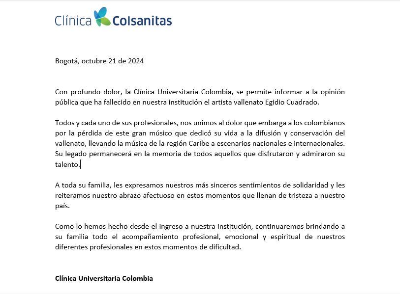 La clínica confirmó el fallecimento del artista vallenato en un comunicado expedido este lunes en el que señala que todos sus profesionales se unen “al dolor que embarga los colombianos por la pérdida de este gran músico que dedicó su vida a la difusión y conservación del vallenato, llevando la música de la región Caribe a escenarios nacionales e internacionales”.