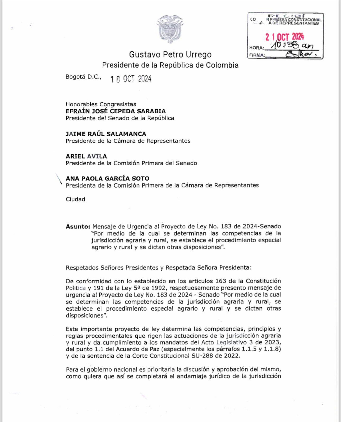 Gobierno radicó mensaje de urgencia para la ley ordinaria de jurisdicción agraria