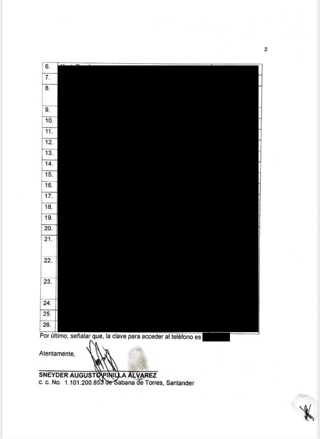 “SNEYDER AUGUSTO PINILLA ÁLVAREZ, identificado como aparece al pie de mi firma, por medio de la presente, actuando en el marco del principio de oportunidad que actualmente se tramita en su despacho y de conformidad a los compromisos adquiridos en dicho proceso de colaboración, según lo acordado con la delegada fiscal, se ofrece y se entrega el equipo celular marca Apple modelo Iphone 14, perteneciente al suscrito, para que se realice una extracción selectiva y controlada forense de los números telefónicos de las personas que me permito relacionar a continuación, lo cual, es única y exclusivamente con fines judiciales vía cooperación”, se lee en el oficio en el que se oficializa la entrega del celular para procedimiento de extracción controlada.