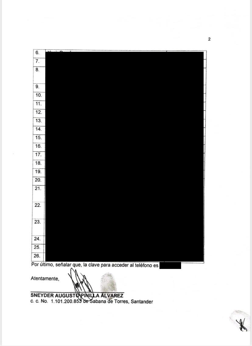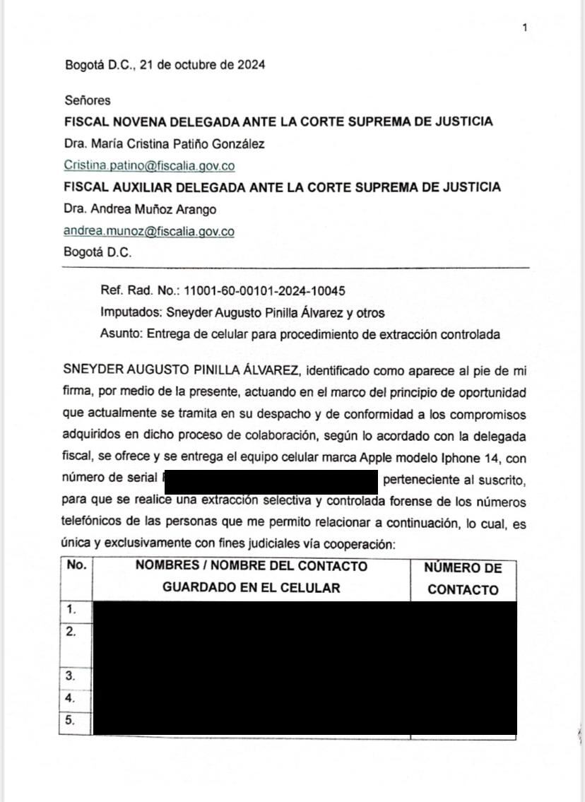 “SNEYDER AUGUSTO PINILLA ÁLVAREZ, identificado como aparece al pie de mi firma, por medio de la presente, actuando en el marco del principio de oportunidad que actualmente se tramita en su despacho y de conformidad a los compromisos adquiridos en dicho proceso de colaboración, según lo acordado con la delegada fiscal, se ofrece y se entrega el equipo celular marca Apple modelo Iphone 14, perteneciente al suscrito, para que se realice una extracción selectiva y controlada forense de los números telefónicos de las personas que me permito relacionar a continuación, lo cual, es única y exclusivamente con fines judiciales vía cooperación”, se lee en el oficio en el que se oficializa la entrega del celular para procedimiento de extracción controlada.