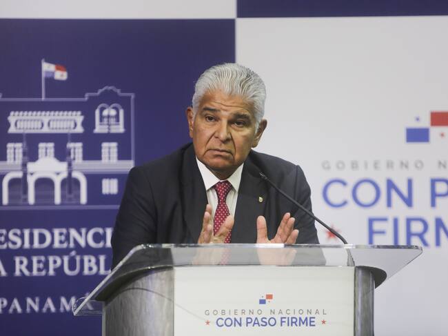 AME580. CIUDAD DE PANAMÁ (PANAMÁ), 24/10/2024.- El presidente panameño, José Raúl Mulino, habla en conferencia de prensa en el anfiteatro de la presidencia este jueves, en Ciudad de Panamá (Panamá). Mulino se quejó de que vecinos latinoamericanos y usuarios del canal interoceánico como Ecuador, Perú y Chile, mantienen a Panamá en listas discriminatorias por asuntos que muchas veces se puede resolver bilateralmente, y expresó que esa situación no puede continuar. EFE/Carlos Lemos / Carlos Lemos (EFE)