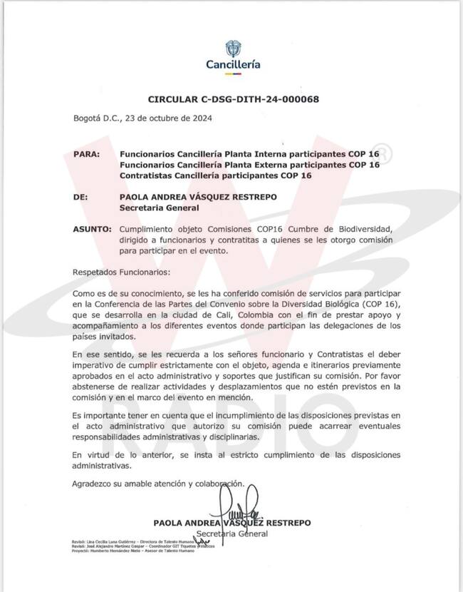 “Se les recuerda a los señores funcionarios y contratistas el deber imperativo de cumplir estrictamente con el objetivo, agente e itinerarios previamente aprobados en el acto administrativo y soportes que justifican su comisión. Por favor abstenerse de realizar actividades y desplazamientos que no estén previstos en la comisión y en el marco del evento en mención”, indicó.