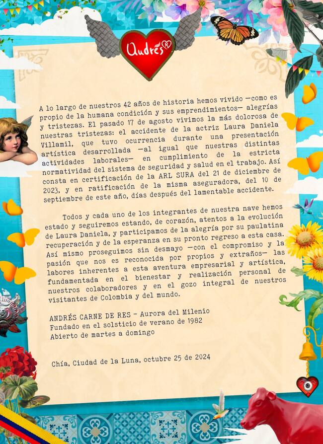 En una carta pública, el reconocido restaurante Andrés Carne de Res se refirió al accidente sufrido por Laura Daniela Villamil, joven actriz y miembro de su equipo, quien resultó gravemente herida durante una presentación artística el pasado 17 de agosto. La misiva resalta que el incidente se produjo “en cumplimiento de la estricta normatividad del sistema de seguridad y salud en el trabajo,” en referencia a certificaciones de la ARL SURA, entidad encargada de la seguridad en el trabajo, que respaldaron el cumplimiento de protocolos de seguridad tanto en diciembre de 2023 como tras el accidente en septiembre de este año.