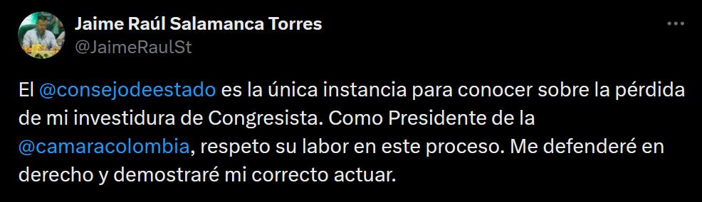 En respuesta, el representante se pronunció desde su cuenta de X, diciendo: “el Consejo de Estado es la única instancia para conocer sobre la pérdida de mi investidura de Congresista. Como presidente de la Cámara de Representantes, respeto su labor en este proceso. Me defenderé en derecho y demostraré mi correcto actuar».