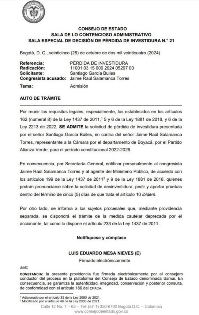El Consejo de Estado aceptó la solicitud de pérdida de investidura en contra del congresista boyacense, por el partido Alianza Verde, para el periodo 2022-2026 y hoy presidente de la Cámara de Representantes, Jaime Raúl Salamanca Torres.
