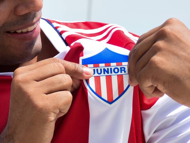 Un aficionado del Junior muestra el escudo este miércoles durante la celebración de los 100 años del club, en Barranquilla (Colombia). EFE/ Aleydis Coll / Aleydis Coll (EFE)