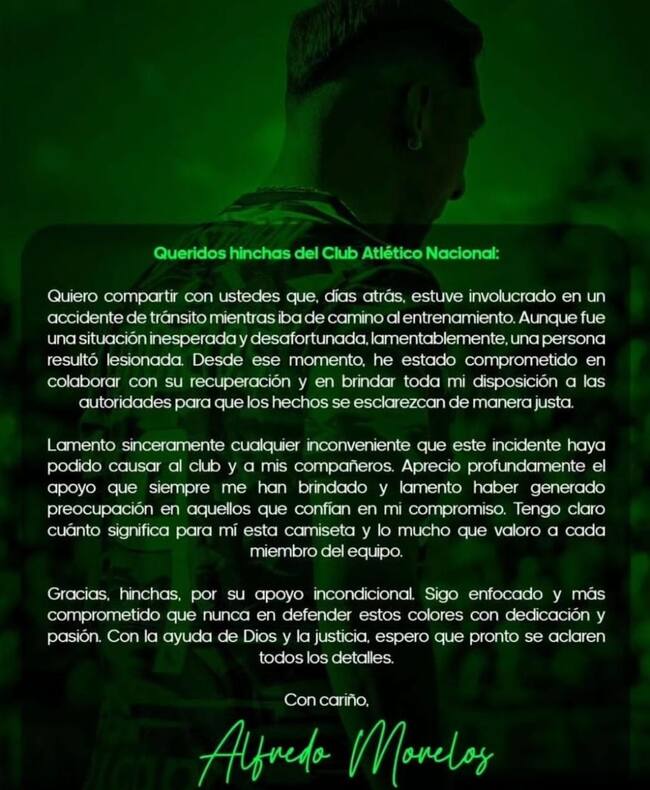 Alfredo Morelos, delantero de Atlético Nacional, destacó que desde el accidente ha estado “comprometido en colaborar con su recuperación (la del herido en los hechos) y en brindar toda mi disposición a las autoridades para que los hechos se esclarezcan de manera justa”.