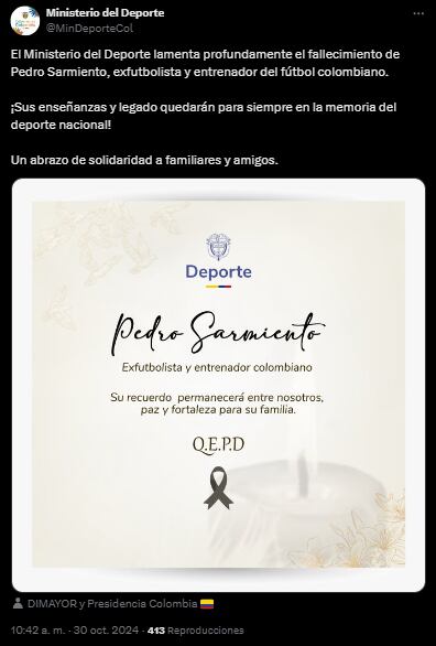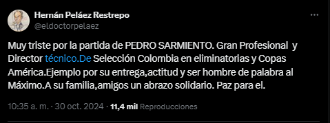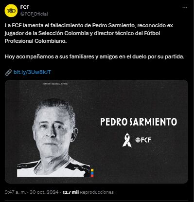 Sin embargo, en horas de la mañana, amigos, periodistas y entidades como la Federación Colombiana de Fútbol, Dimayor, Independiente Medellín, el Comité Olímpico Colombiano y otros clubes del balompié nacional, publicaron sus condolencias ante el supuesto fallecimiento de Sarmiento.
