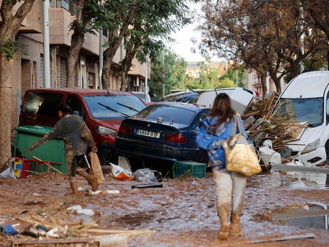 CATARROJA (VALENCIA), 31/10/2024.- Varias personas caminan entre el lodo acumulado en las calles tras las intensas lluvias caídas por la dana. (EFE/Manuel Bruque) / Manuel Bruque (EFE)