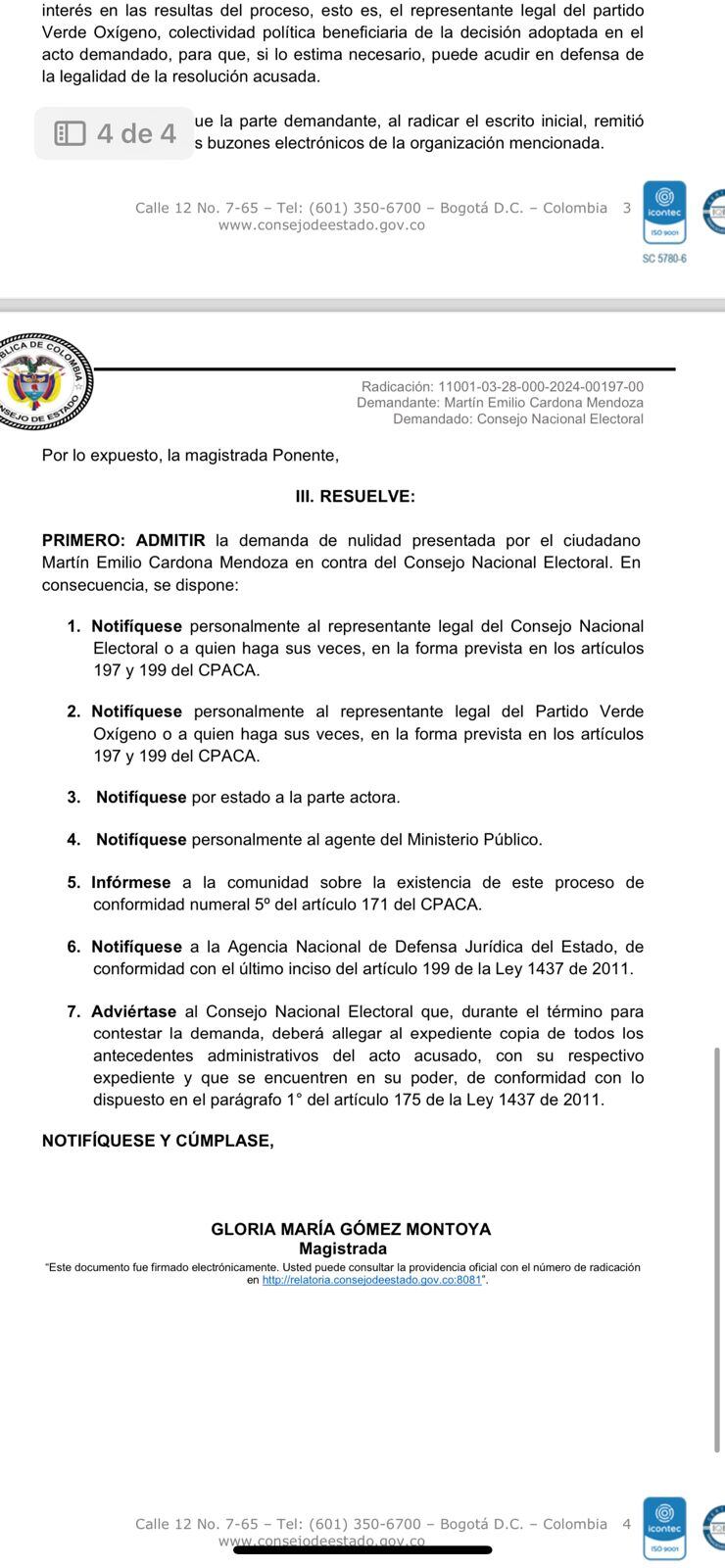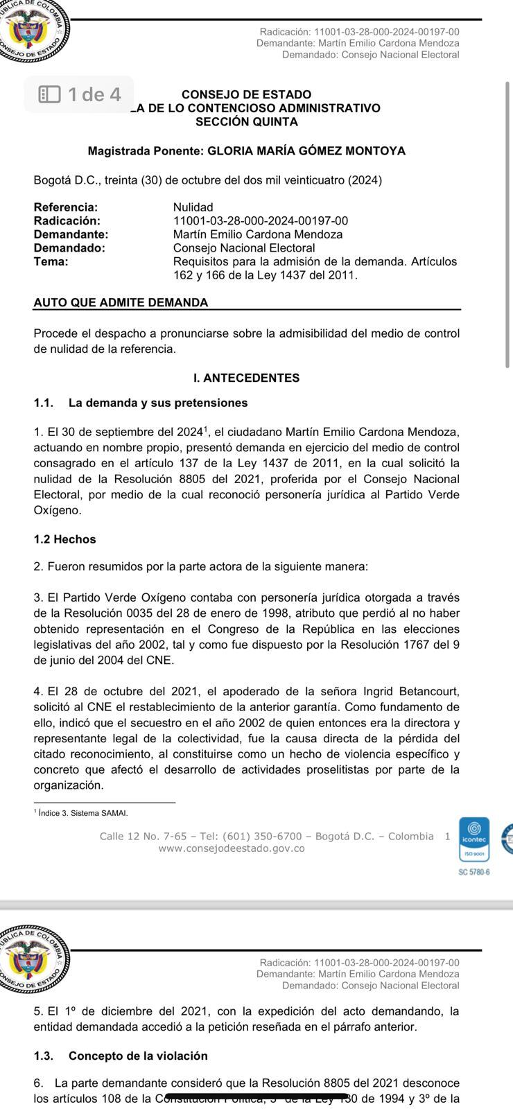 El Consejo de Estado admitió para su estudio una demanda presentada por el ciudadano Martín Emilio Cardona, que busca la nulidad de la Resolución 8805 de 2021 del Consejo Nacional Electoral (CNE), la cual restableció la personería jurídica al Partido Verde Oxígeno.