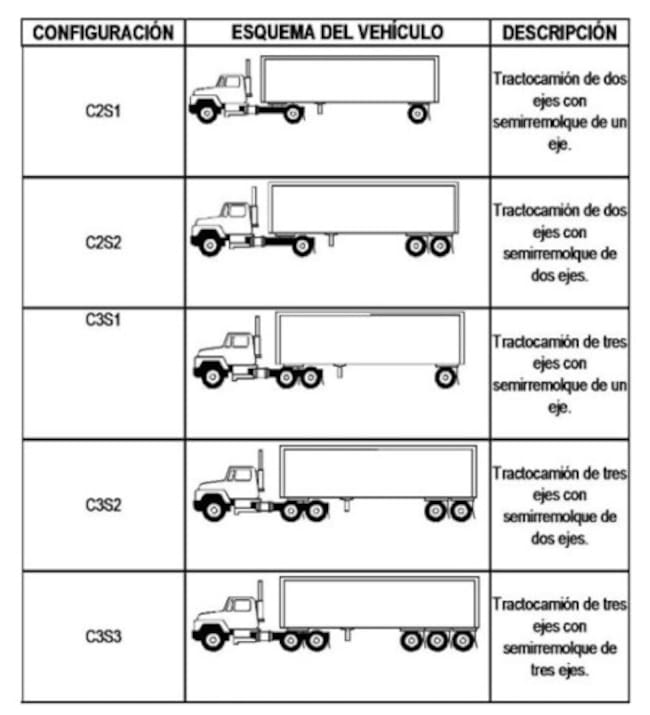 Para el caso de tractocamión, se clasifica bajo la letra haciendo referencia a la cantidad de semirremolques y ejes. Por ejemplo, S1 hace referencia a un semirremolque de 1 eje y el R2 hace referencia a un remolque de 2 ejes, pero si se realiza la combinación se obtiene la configuración de una tractomula.