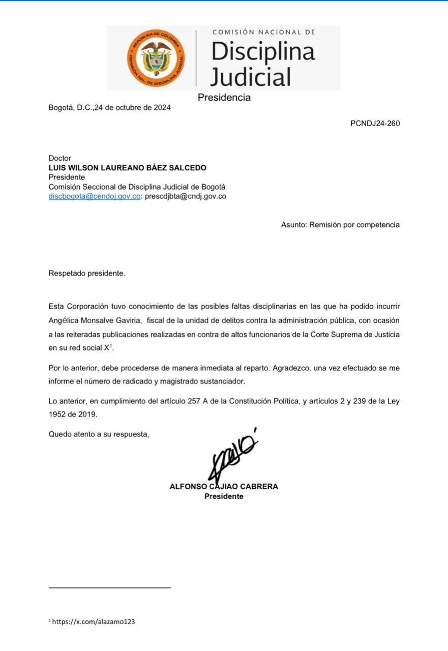 El presidente de la CNDJ, Alfonso Cajiao Cabrera, afirmó que se compulsaron copias a la Seccional Bogotá para evaluar si Monsalve incurrió en faltas disciplinarias, “en virtud del artículo 32 de la Ley 1123 de 2007″.