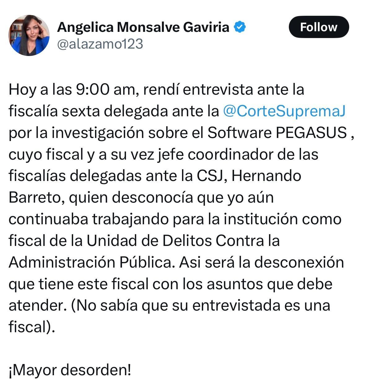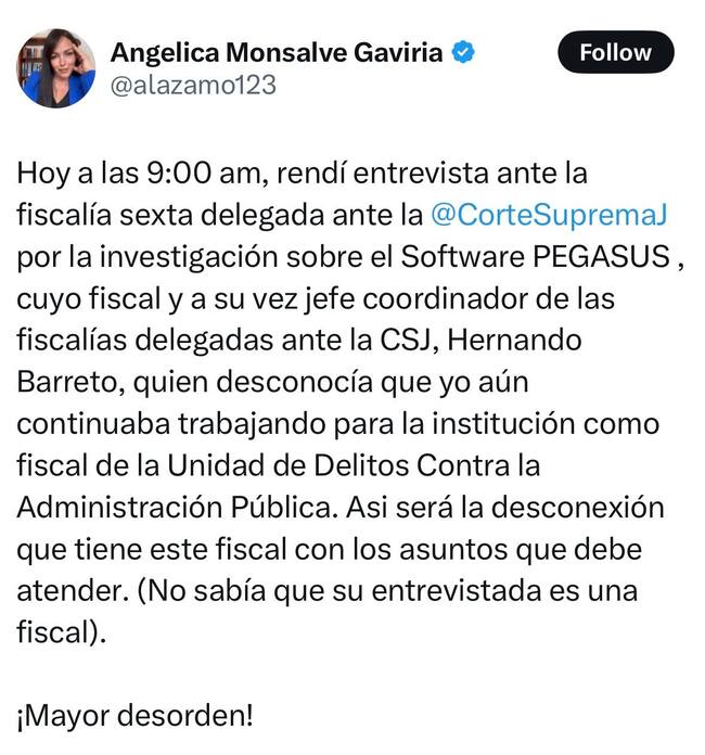 Además de sus críticas al presidente de la Corte, Monsalve se refirió a una entrevista reciente ante la Fiscalía, en el marco de la investigación sobre el software Pegasus, un controvertido sistema de espionaje. Monsalve mencionó que el fiscal encargado de esta investigación, Hernando Barreto, desconocía que ella aún trabajaba como fiscal en la Unidad de Delitos Contra la Administración Pública, lo cual interpretó como un reflejo del “desorden” en la institución.
