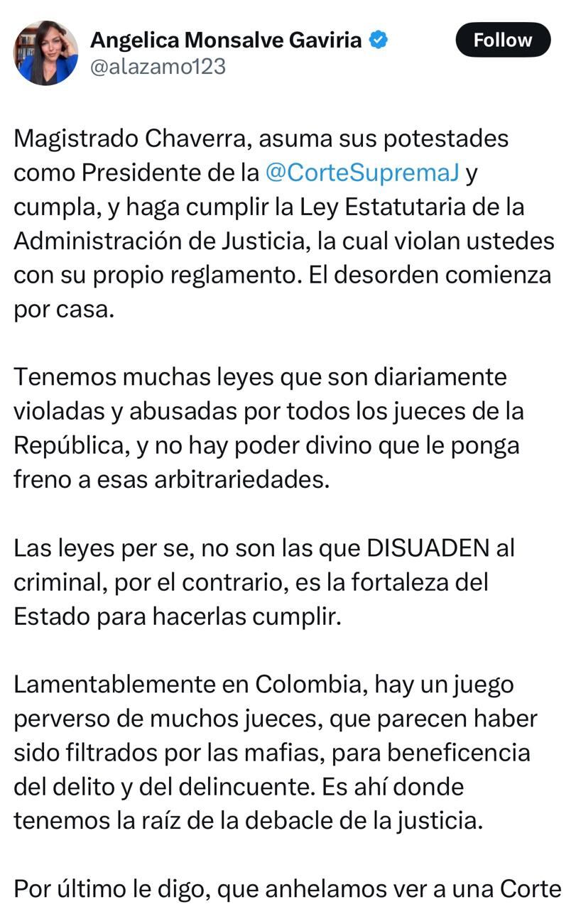 Monsalve cuestionó en la red social X la gestión de Chaverra como presidente de la Corte Suprema, pidiéndole “cumplir y hacer cumplir la Ley Estatutaria de la Administración de Justicia” y acusando a los jueces de la República de “violar y abusar diariamente” las leyes en beneficio de la criminalidad.