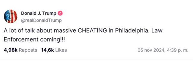 El expresidente y actual candidato republicano de Estados Unidos, Donald Trump, denunció a través de su red social, Truth Social, un “fraude masivo” en Filadelfia, un estado clave en las elecciones presidenciales.