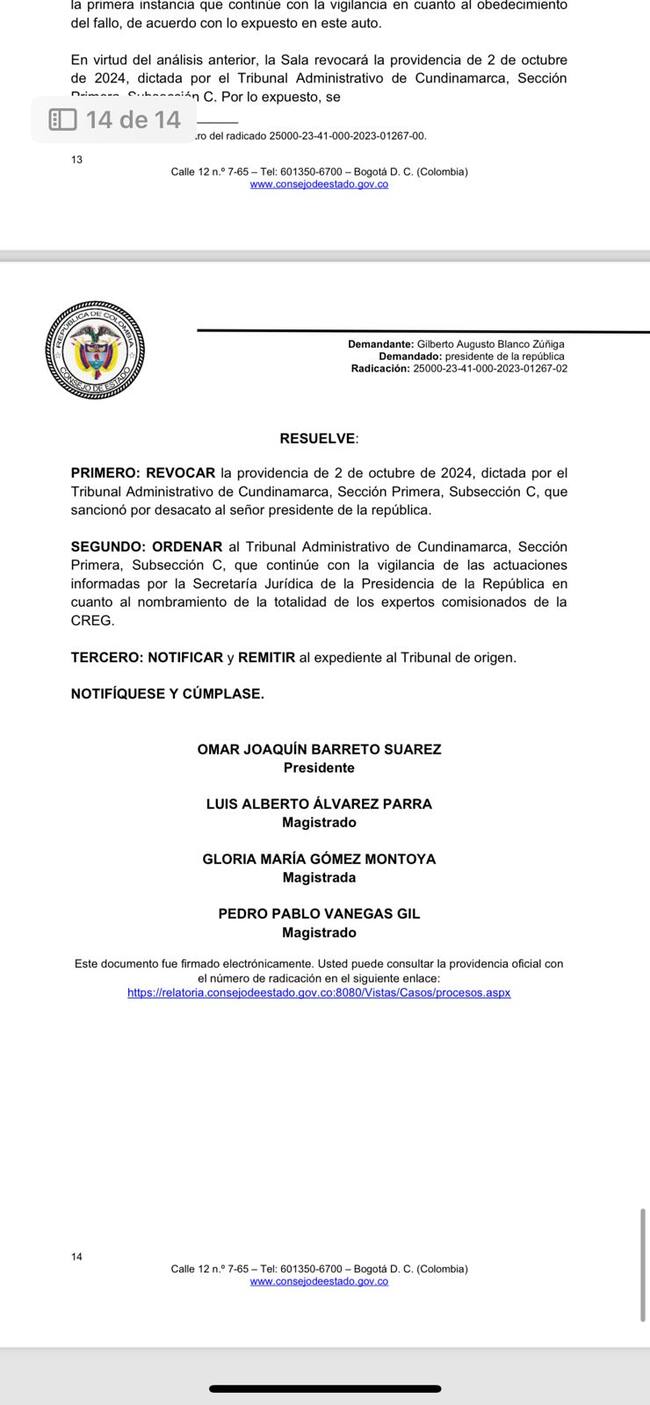 El Consejo de Estado revocó la decisión del Tribunal Administrativo de Cundinamarca que imponía una multa de cinco salarios mínimos mensuales al presidente Gustavo Petro por presunto desacato en el nombramiento de seis comisionados para la Comisión de Regulación de Energía y Gas (CREG).