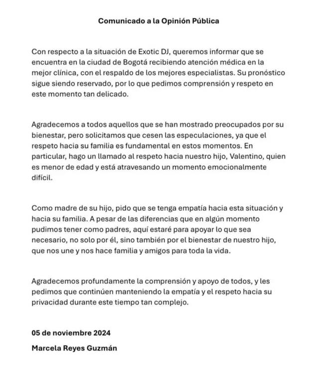 En cuanto al estado de salud de DJ Exotic, su excompañera sentimental, Marcela Reyes, compartió en redes sociales que el joven fue trasladado a Bogotá para recibir tratamiento especializado y que su pronóstico sigue siendo reservado.
