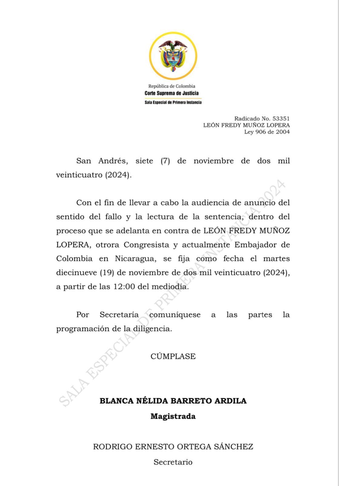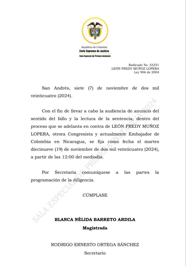 “Con el fin de llevar a cabo la audiencia de anuncio del sentido del fallo y la lectura de la sentencia, dentro del proceso que se adelanta en contra de LEÓN FREDY MUÑOZ LOPERA, otrora Congresista y actualmente Embajador de Colombia en Nicaragua, se fija como fecha el martes diecinueve (19) de noviembre de dos mil veinticuatro (2024), a partir de las 12:00 del mediodía”, dice el documento de la Corte.
