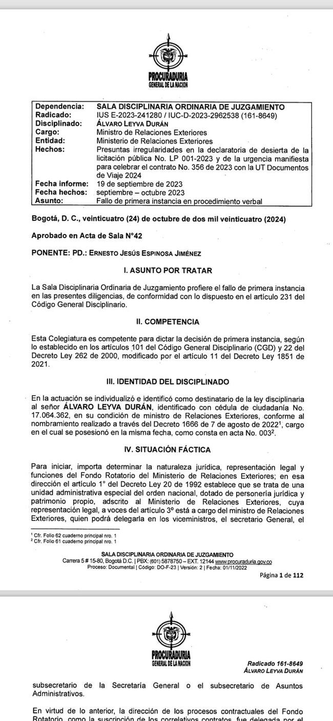 La Procuraduría General de la Nación fundamentó su sanción contra el exministro de Relaciones Exteriores, Álvaro Leyva Durán, señalando que su decisión de declarar desierta la licitación para la emisión de pasaportes fue contraria a los principios de contratación estatal.