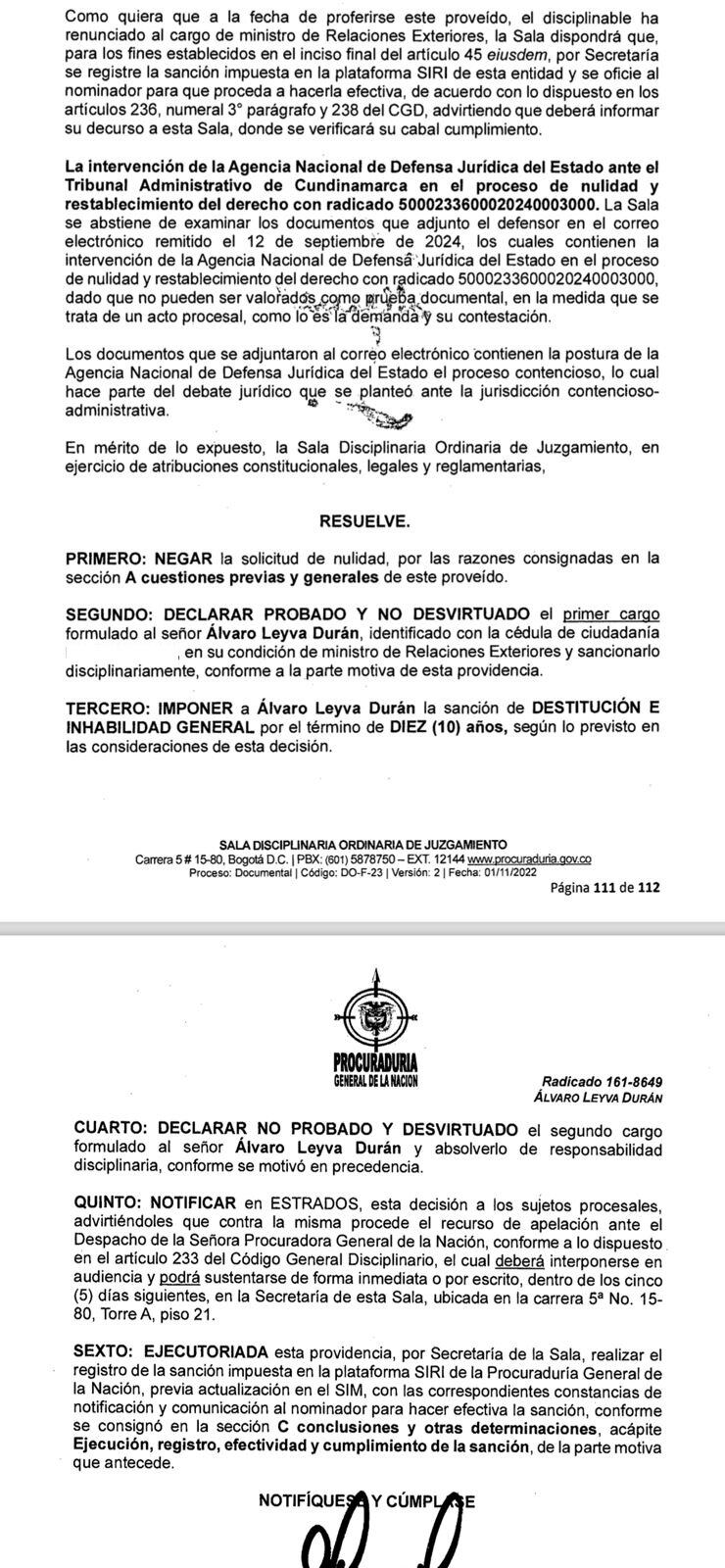 La Procuraduría General de la Nación sancionó con destitución e inhabilidad al exministro de Relaciones Exteriores, Álvaro Leyva, por 10 años para ejercer cualquier cargo público, por las irregularidades encontradas en su manejo frente al proceso de licitación de los pasaportes y la empresa Thomas Greg and Sons.