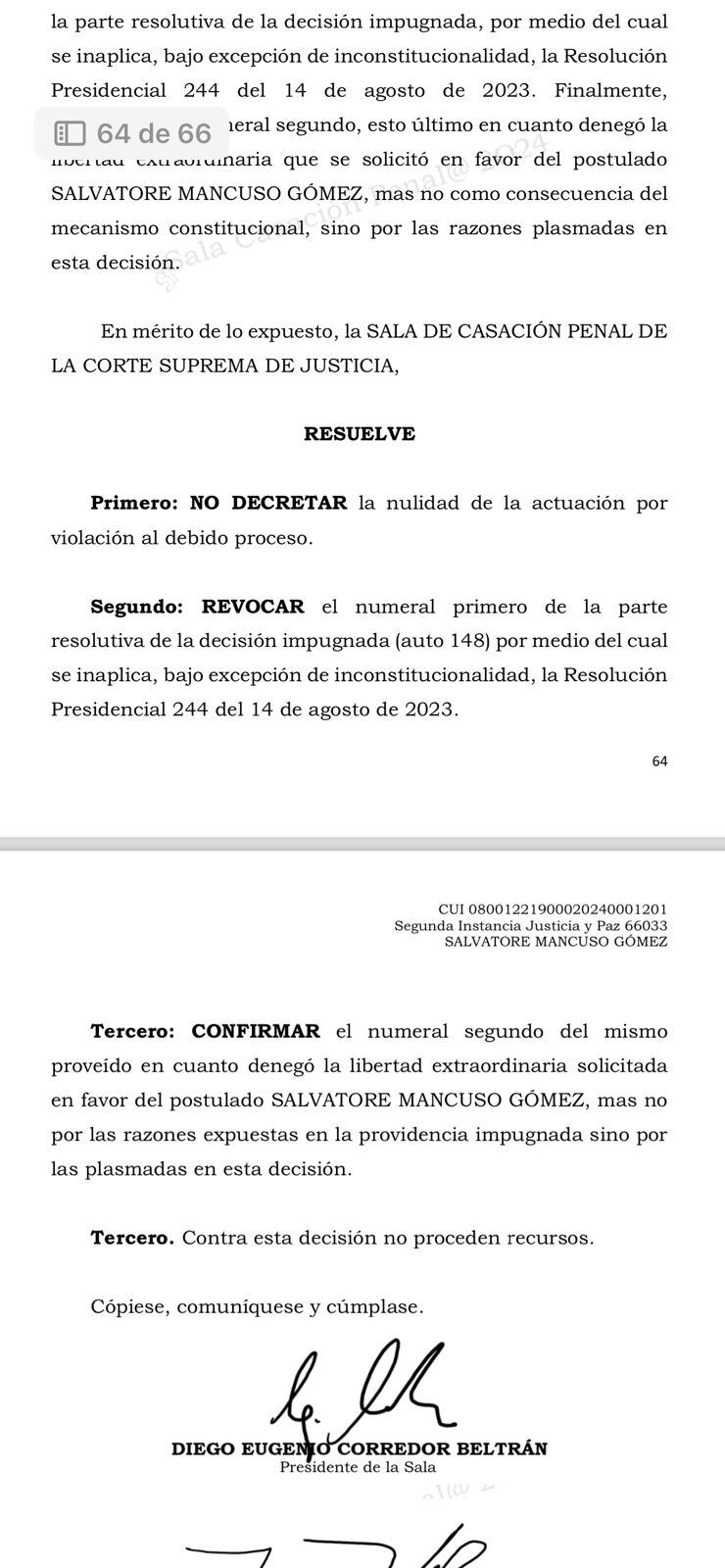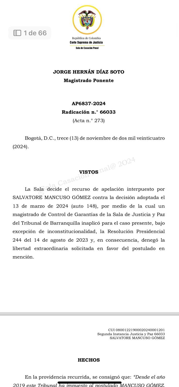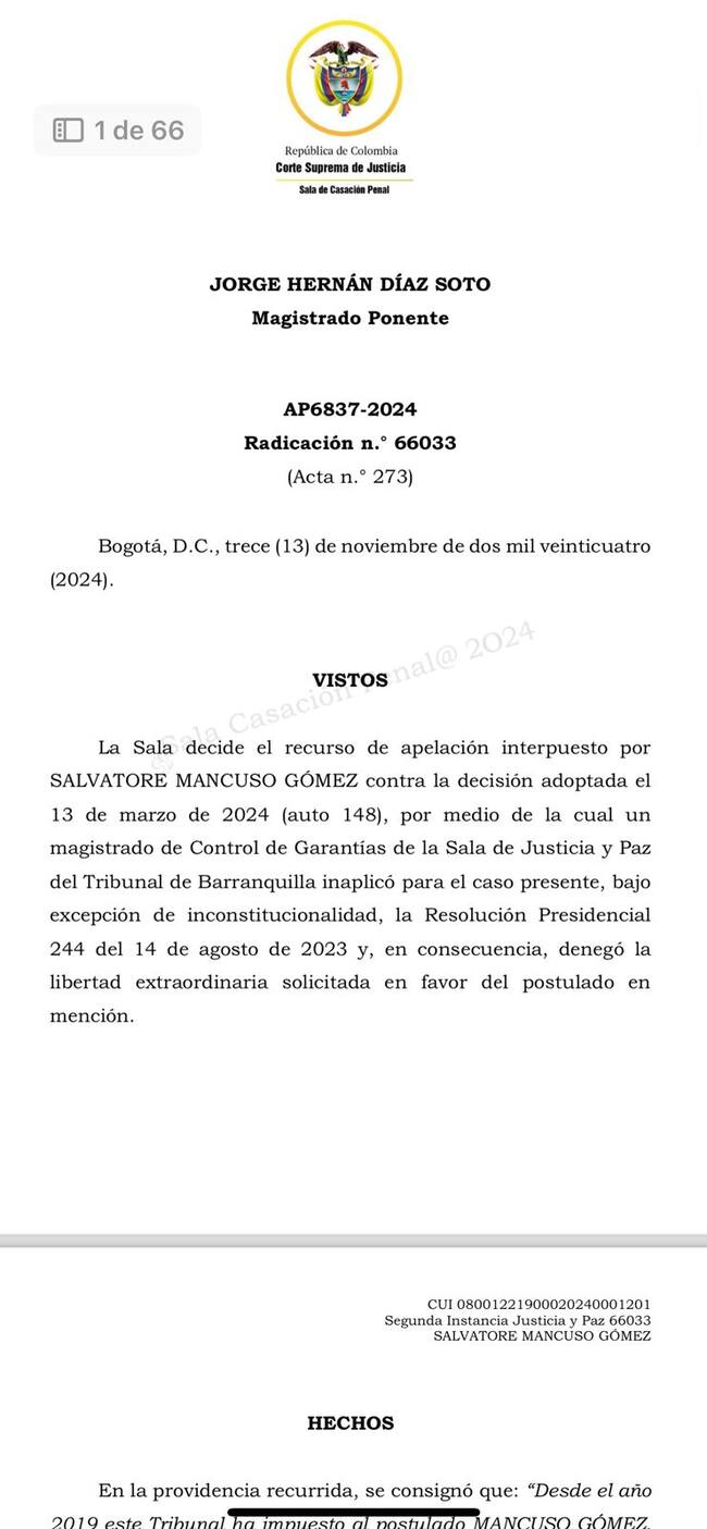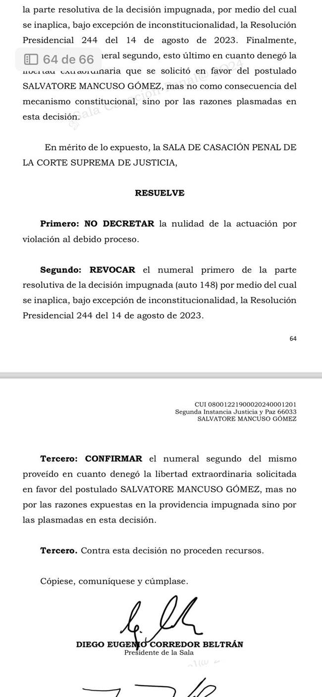 La Sala de Casación Penal de la Corte Suprema de Justicia confirmó la decisión de primera instancia de la sala de Justicia y Paz del Tribunal Superior de Barranquilla, que le había negado la libertad al exjefe paramilitar Salvatore Mancuso Gómez, bajo la figura de gestor de paz como lo pedía el Gobierno Nacional.