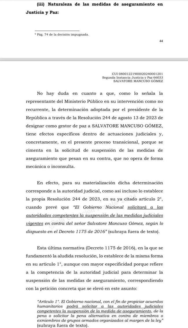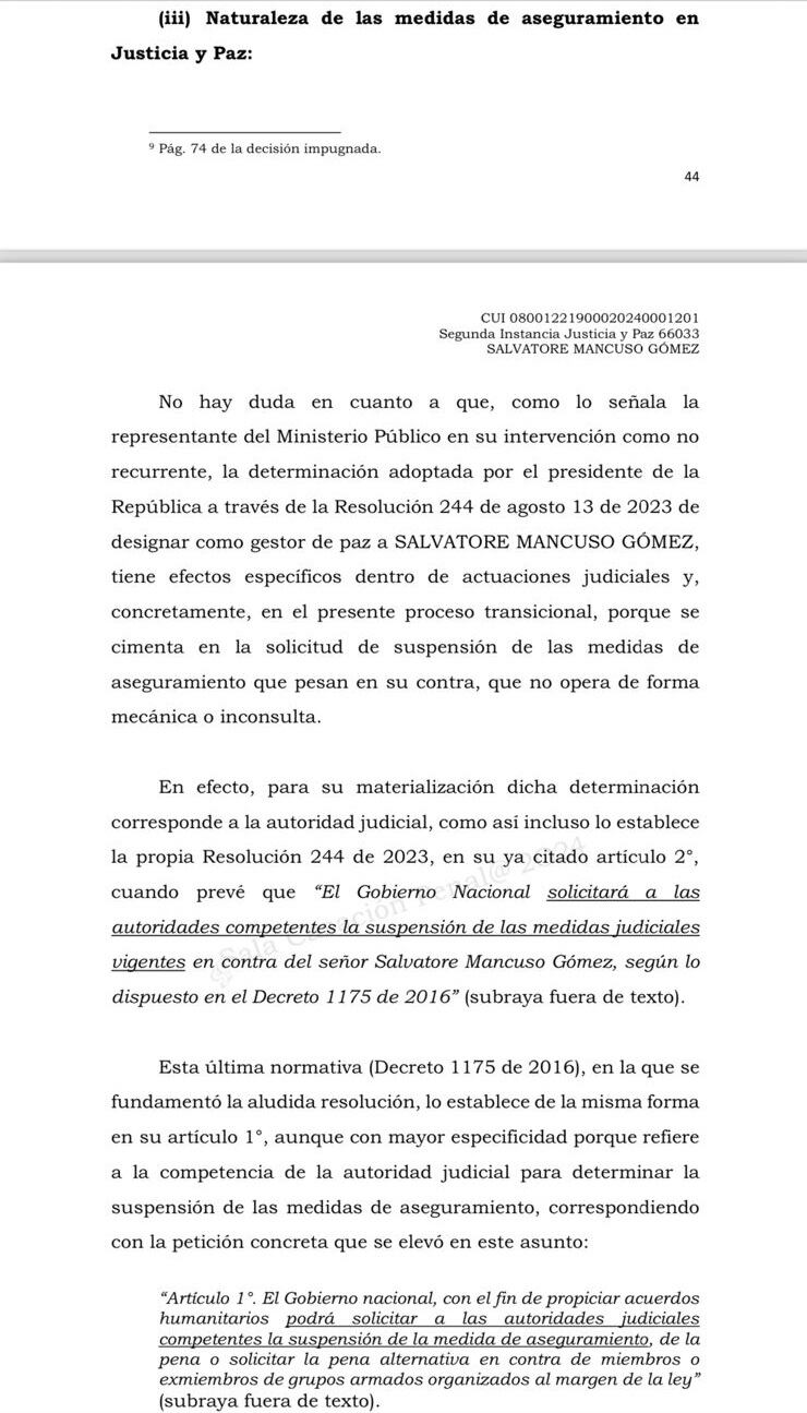 Está decisión, que había sido tomada inicialmente por un magistrado de Justicia y Paz en Barranquilla, subraya que el rechazo no afecta realmente su estatus de gestor, ya que Mancuso no obtuvo el beneficio de libertad bajo esa figura, sino por un beneficio de Justicia y Paz que ya se le había concedido.