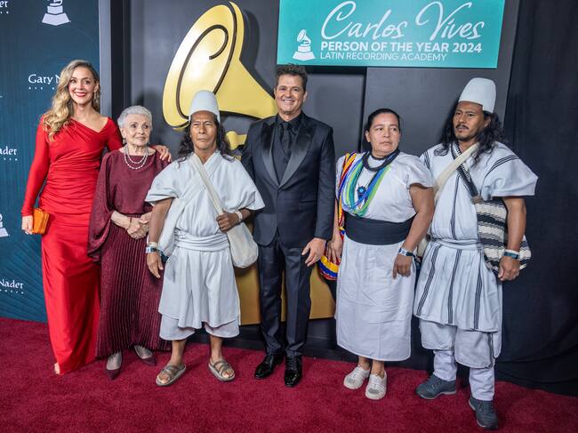 Miami Beach (United States), 14/11/2024.- Colombian singer Carlos Vives (C) Vives' wife Claudia Elena, (L), Vives' mother Aracelly (2-L) and the traditional band Indios Arhuacos, attend the red carpet at the Latin Grammy Person of the Year event. EFE/EPA/CRISTOBAL HERRERA-ULASHKEVICH / CRISTOBAL HERRERA-ULASHKEVICH (EFE)