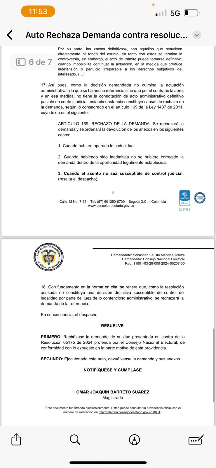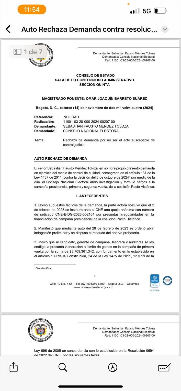 En un reciente documento, el Consejo de Estado rechazó la demanda de nulidad presentada por Sebastián Fausto Méndez Toloza contra la resolución emitida el 8 de octubre de 2024 por el Consejo Nacional Electoral (CNE). Dicha resolución abrió una investigación y formuló cargos a la campaña presidencial de la coalición Pacto Histórico en primera y segunda vuelta.