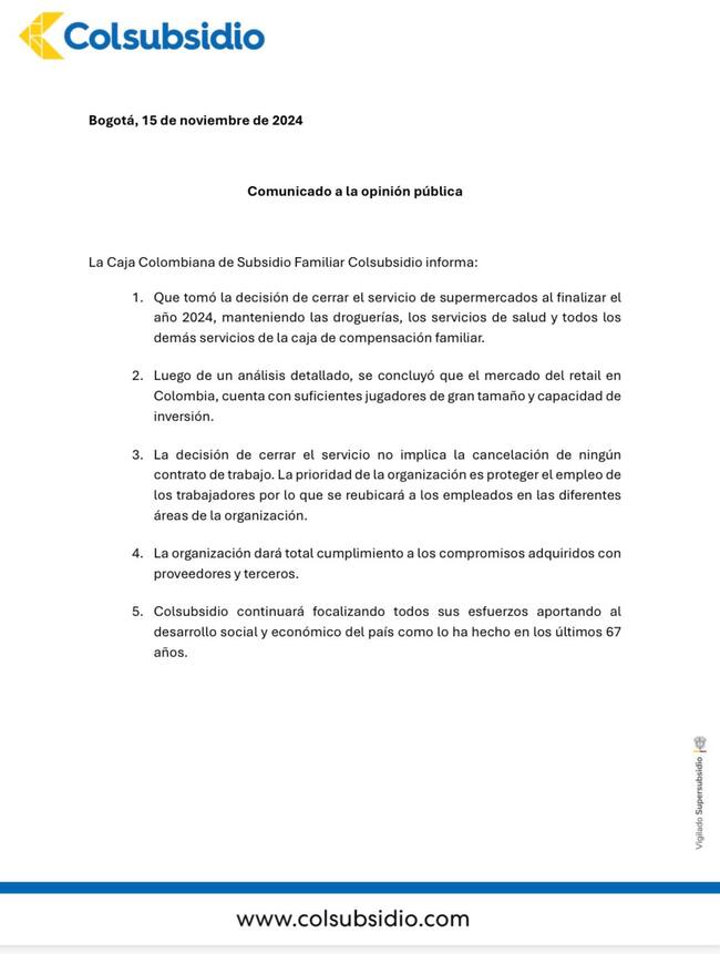 Colsubsidio anunció que cerrará sus supermercados al finalizar este año, pero mantendrá las droguerías, los servicios de salud y los demás servicios de la caja de compensación familiar.